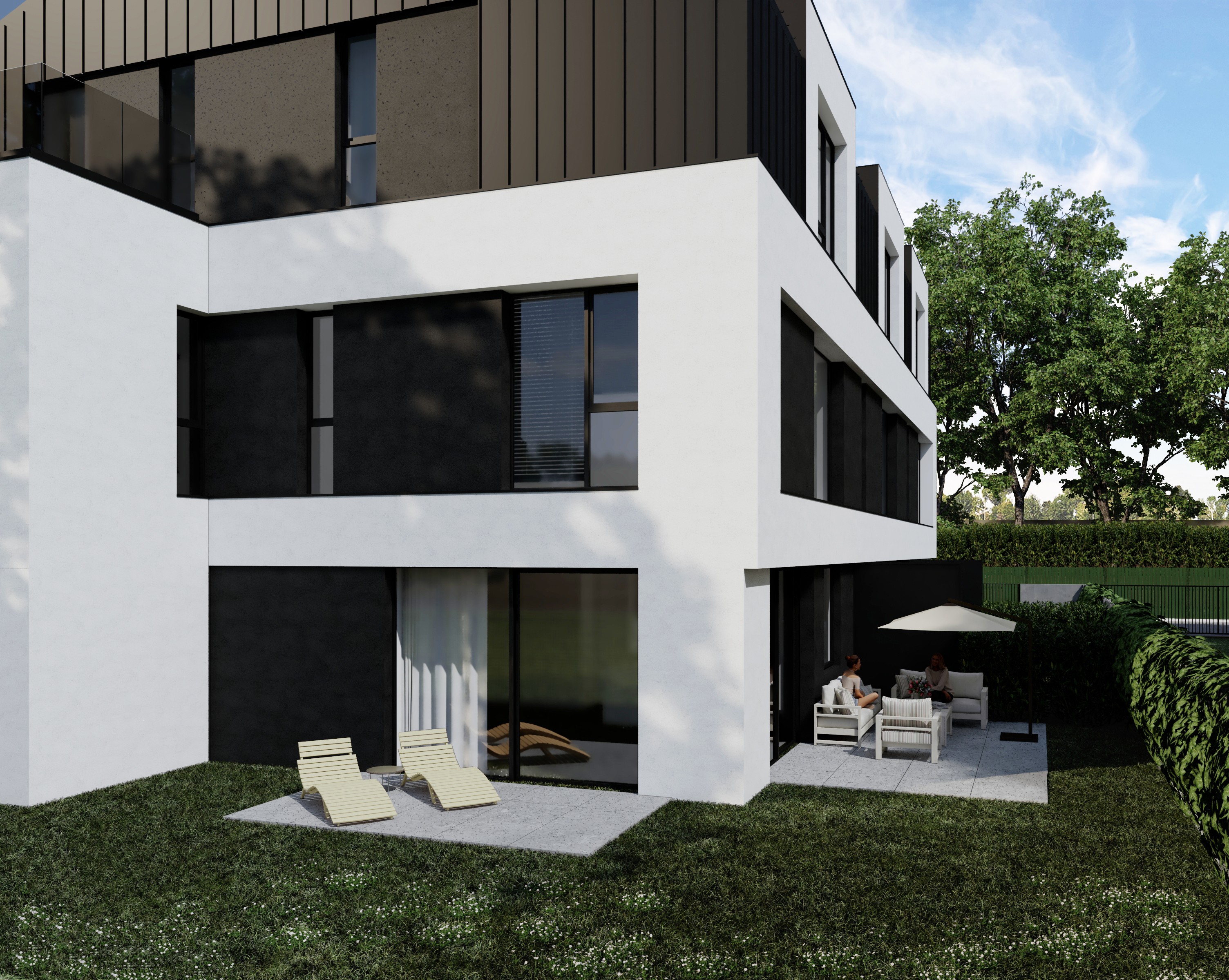Sprzedawana nieruchomość jest narożnym segmentem w trzy-częściowym budynku. Każdy z segmentów posiada swój własny ogród do indywidualnej aranżacji oraz przestrzeń wspólną przed budynkiem, która umożliwia swobodne parkowanie samochodów i wjazd do garaży.